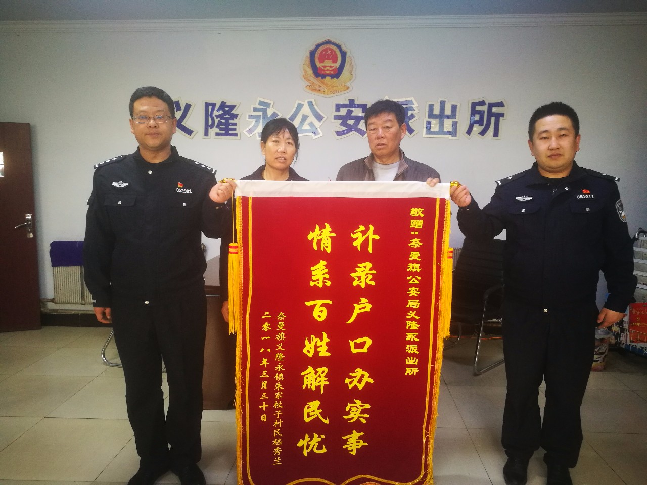 “警察同志,真的太谢谢你们了,我姐这回有保障了”,4月2日,365277_det365娱乐官网登录_36365最新线路检测义隆永镇朱家杖子村嵇大娘的妹妹和妹夫来到365277_det365娱乐官网登录_36365最新线路检测公安局义隆永派出所,将一面写有“补录户口办实事 情系百姓解民忧”的锦旗送到派出所民警手中,对派出所民警帮助嵇大娘补录丢失了二十年的户口表示感谢。